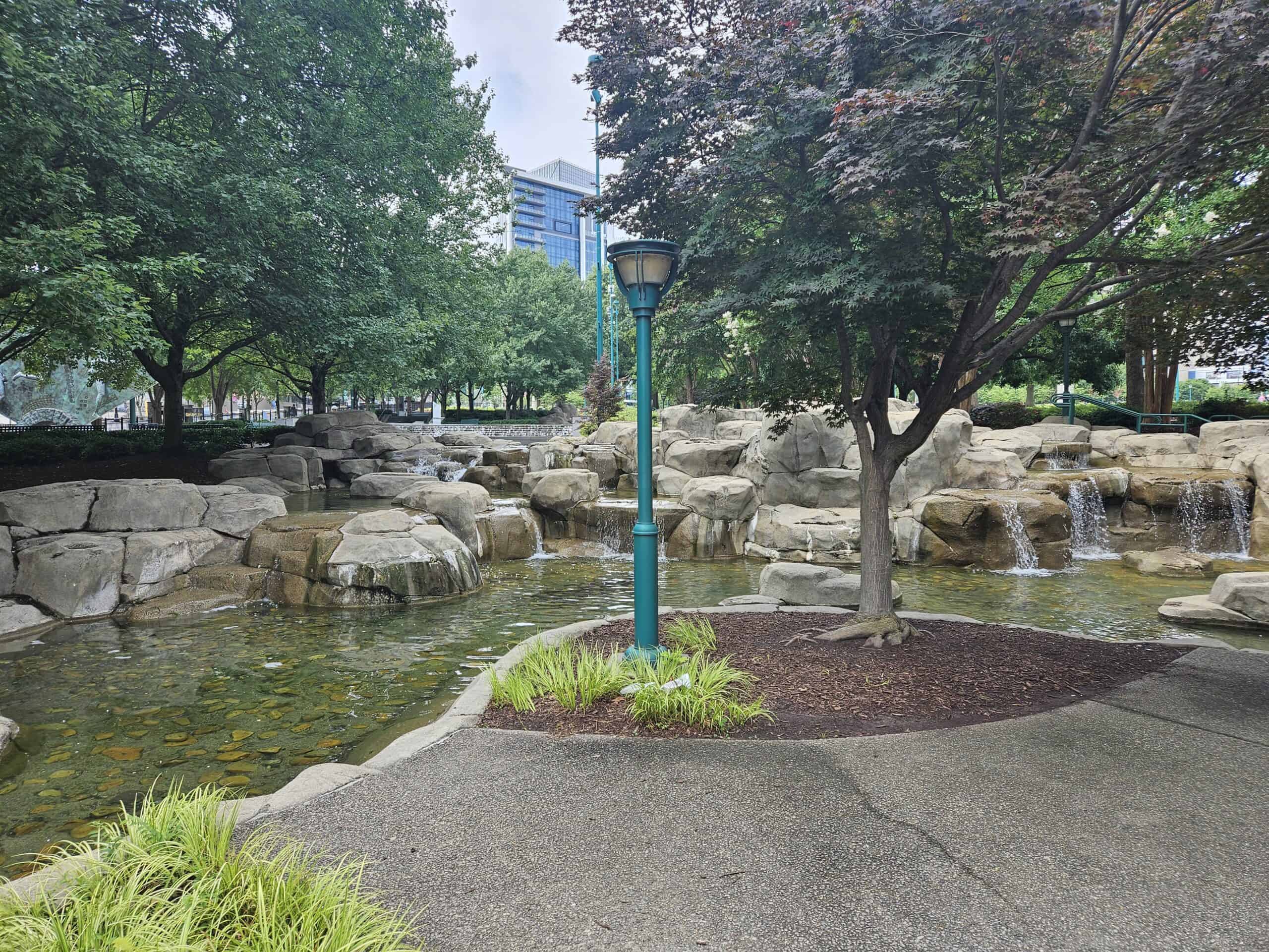 Atlanta once hosted the Olympics, but you wouldn’t know it by how the city showcases itself. Centennial Park is probably the only spot in the whole city that seems to care that there was an Olympics. The park is beautiful. There are the Olympic Rings that everyone takes their picture at, a splash pad with the rings is also lovely. Each section of the park has something really special, including playgrounds (an inclusive playground), waterfalls, statues, and memorials. Everything was up to date and clean. It was wonderful to walk around and enjoyable for all ages.